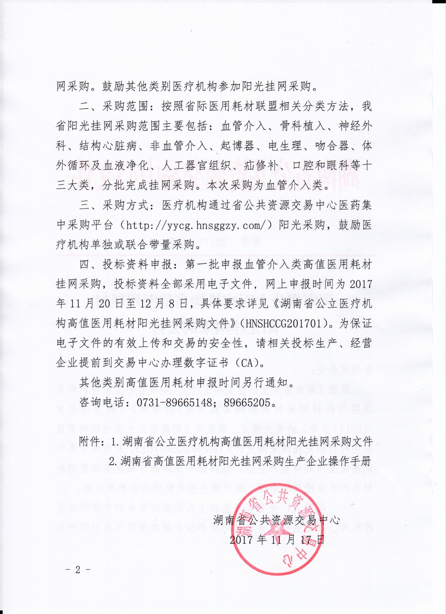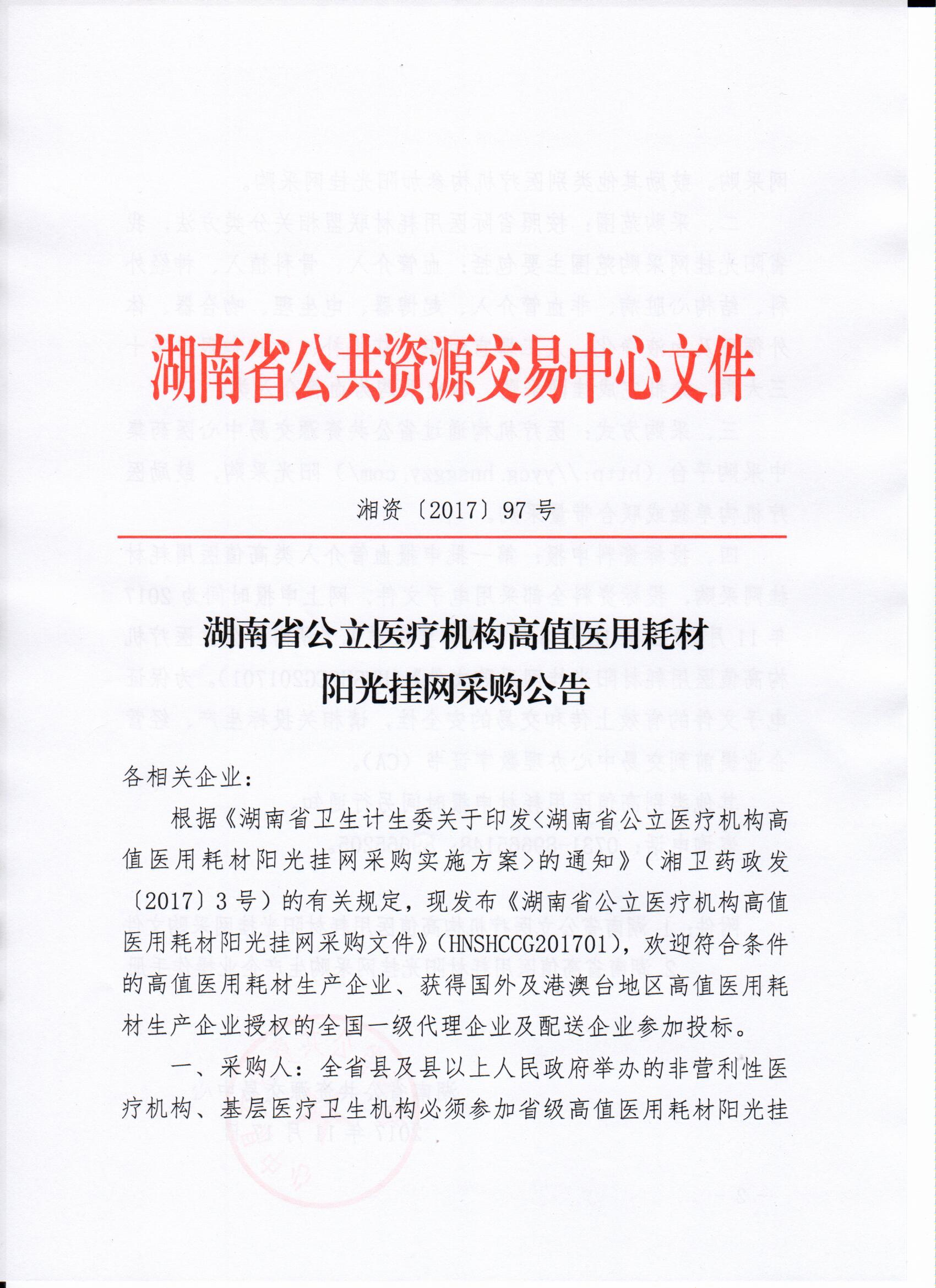 湖南省公立醫(yī)療機構高值醫(yī)用耗材陽光掛網采購公告
