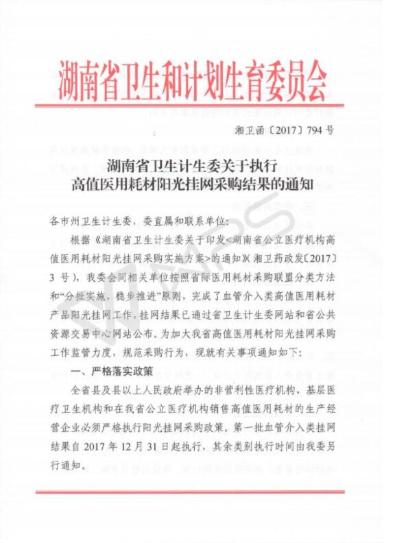 湖南省衛(wèi)生計(jì)生委關(guān)于執(zhí)行高值醫(yī)用耗材陽(yáng)光掛網(wǎng)采購(gòu)結(jié)果的通知