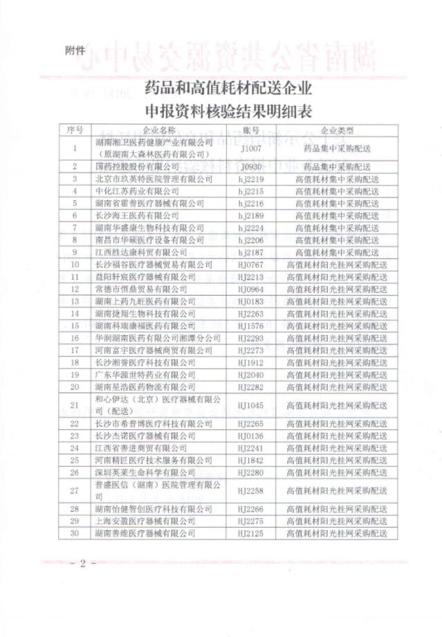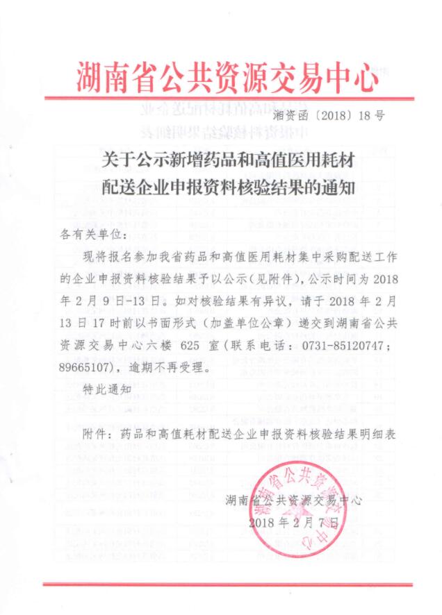 關(guān)于湖南省公示新增藥品和高值醫(yī)用耗材配送企業(yè)申報資料核驗結(jié)果的通知
