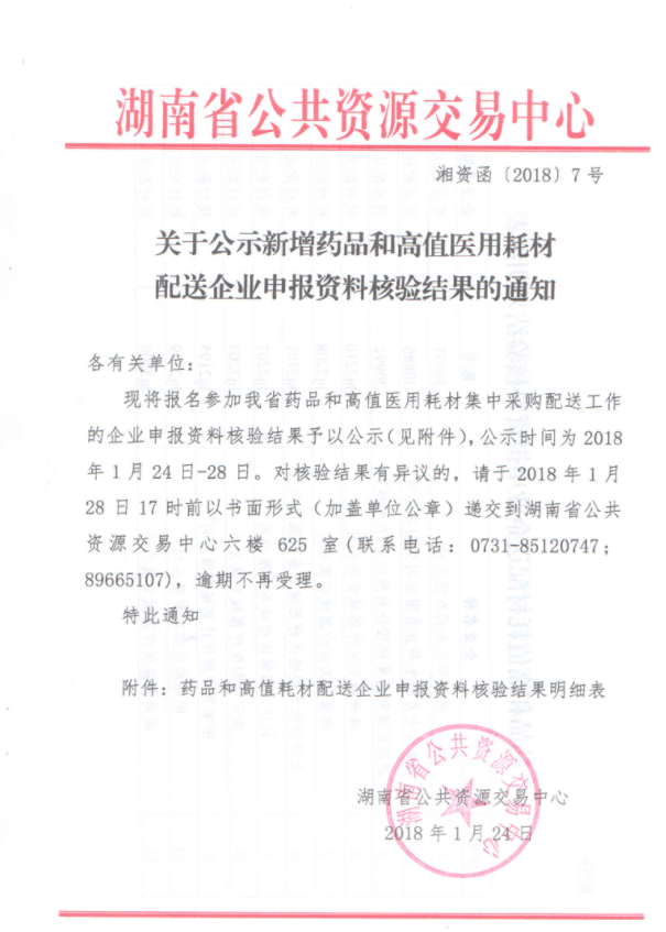 湖南省關(guān)于公示新增藥品和高值醫(yī)用耗材配送企業(yè)申報(bào)資料核驗(yàn)結(jié)果的通知
