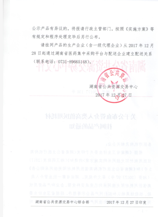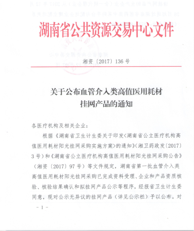 湖南省關(guān)于公布血管介入類高值醫(yī)用耗材掛網(wǎng)產(chǎn)品的通知